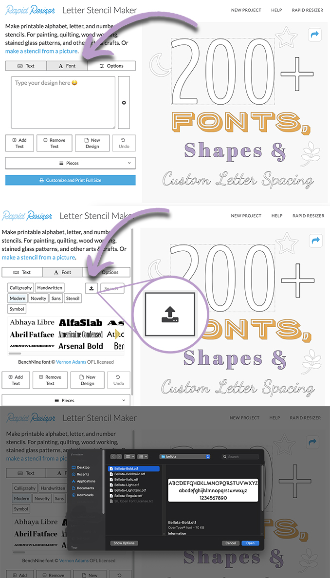 To use your own font in the Letter Stencil Maker, simply click 'font', then the upload button shown below. This will open up files from your device and allow you to choose one.